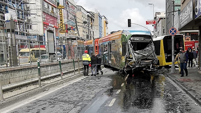 İstanbul Sultangazi'de tramvay ile otobüs çarpıştı. Çarpışmanın etkisiyle tramvay raydan çıktı. Kaza anı kameralara saniye saniye yansıdı.