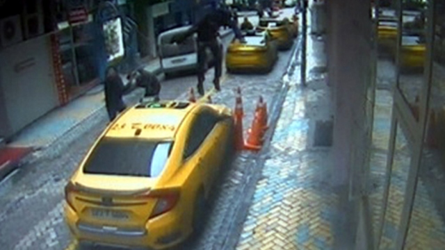 Elazığ'da bir kişi ikinci kattaki bir iş yerine tabela takarken park halindeki bir taksinin üzerine düştü. O anlar güvenlik kamerasınca kaydedildi.