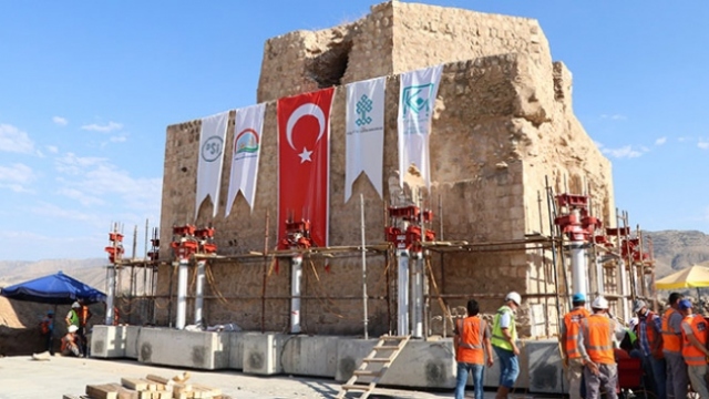 Hasankeyf'te baraj gölünden çıkartılarak 3 kilometre uzaklıktaki arkeolojik park alanına nakledilen 1500 ton ağırlığındaki 1200 yıllık Artuklu Hamamı, başarıyla yerine indirildi.