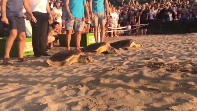Aylar önce Antalya ve Muğla sahillerinde yaralı halde bulunan caretta carettaların tedavileri tamamlandı. Kaplumbağaların denizle buluşmasını turistler ilgi ile izledi.