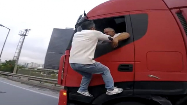 İstanbul TEM Otoyolu İkitelli mevkiinde yabancı uyruklu tırın kendi otomobiline çarpıp kaçtığını gören adam, peşinden koşarak tırmandığı tırın sürücüsüyle seyir halinde yumruklaştı