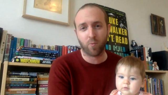 Canlı yayına konuk olan Yazar Ryan Britt sinemanın süper kahramanlarını anlatırken, küçük kızı süper kahramanının yani babasının yanına geldi, yayın boyunca kucağından inmedi.