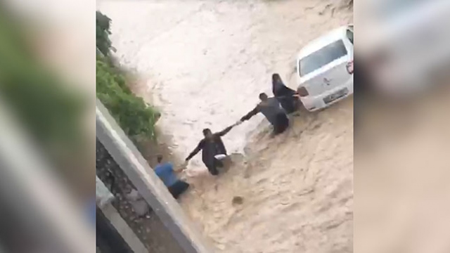 Vatandaşlar aracın sele kapılmasını böyle önledi