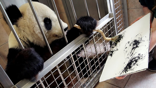 Viyana Hayvanat Bahçesi'nin 18 yaşındaki pandası Yang Yang, bambu boya fırçasıyla yaptığı resimlerle ziyaretçilerini ağırlıyor.