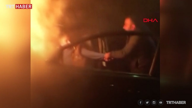 Yanan araçta uyuyakalan alkollü sürücü son anda kurtarıldı
