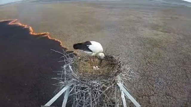 Rusya’nın doğusundaki kırsal alanda çıkan yangında bir leylek, tehlikeye rağmen yuvasını terk etmedi.
