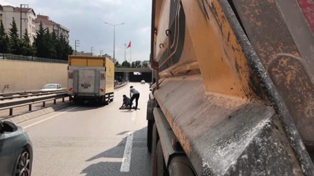 Kocaeli Derince'de bir tır sürücüsü, karayolunda bir otomobilin çarptığı yaralı köpeği korumak için aracını orta şeride park etti.
