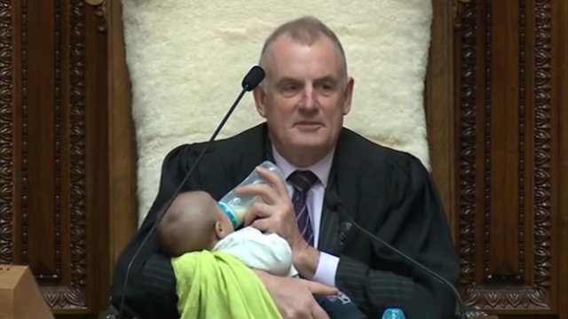 Yeni Zelanda Parlamento Sözcüsü Trevor Mallard, makam koltuğunda 1 aylık bebeği kucağına alarak biberonla süt verdi, renkli görüntüler oluştu.