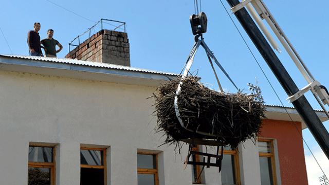 Yıkılacak binanın çatısındaki leylek yuvası taşındı