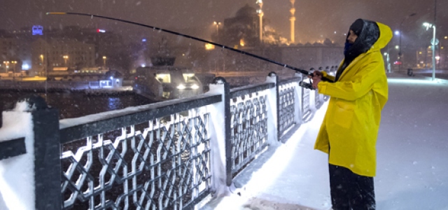 İstanbul'da dün akşam başlayan ve gece fırtınayla iyice şiddetlenen kar yağışına rağmen bazı kişiler Eminönü'nde Galata Köprüsü'nden balık tutmaya devam etti.