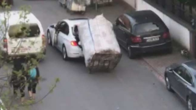 İstanbul'un Ümraniye ilçesinde, bir kadın, atık kağıt yüklü arabasıyla yokuşu çıkamayan çocuğu, arabasının bagajına oturtarak yardım etti.