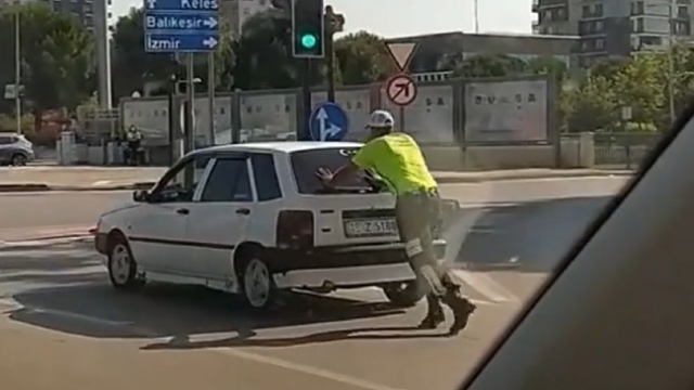 Yolda kalan sürücünün aracını trafik polisi iterek yardım etti