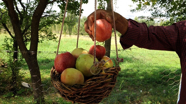 Bingöllü 62 yaşındaki Ömer Çakır, yetiştirdiği elmaları bahçesinin kenarına astığı "göz hakkı sepeti" ile yoldan geçenlere ikram ediyor.