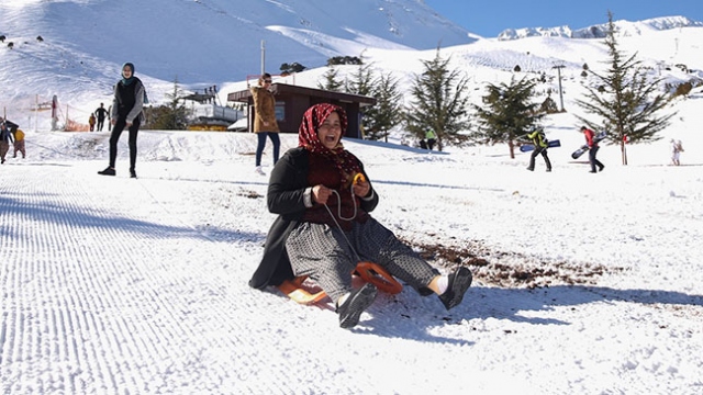 Isparta'daki Davraz Kayak Merkezi'nde kızakla kayarak eğlenceli vakit geçiren 15 Yörük kadın, neşeleriyle ilgi odağı oldu.