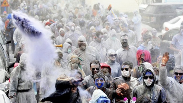 Yunanistan'ın sahil kasabası Galaksidi'de her yıl düzenlenen un savaşına yüzlerce kişi katıldı. Sabahın erken saatlerinde meydanda toplanan kalabalık, undan korunmak için özel kıyafetler giydi.