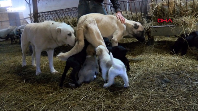 Zonguldak'ta annelerinin sahiplenmediği 2 kuzuya, kangal köpek sahip çıktı. Köpek, kuzuları emziriyor ve kendi yavruları gibi bakıyor.